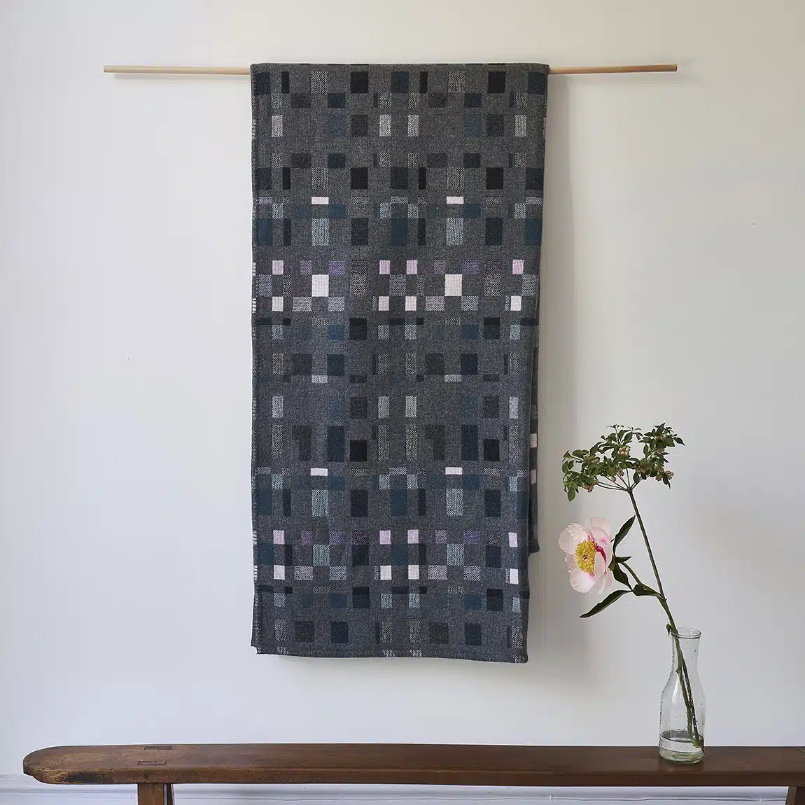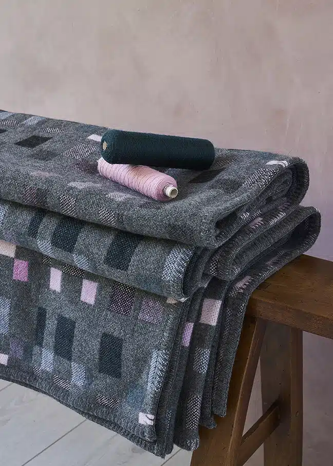 M.C: I always begin with my sketch book or a simple photograph for inspiration then develop several yarn wraps (silk or wool yarn wrapped around small cards to reflect my warp and weft colours). I travel to Bangladesh a lot and always draw and photograph what I see when I’m there. There is a lot of technical information that has to be calculated before I begin weaving, for weaving is as much about geometry and maths as it is about making, and that goes into my trusted graph paper book. Finally I am ready to weave. Unless it is a commissioned art work, I usually make several samples on my loom before I’m happy with the final design and this sample gets sent with a technical document to my mill or Jamdani weavers to produce the blankets and scarves.