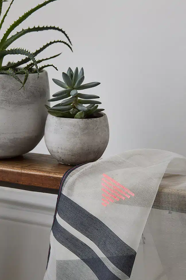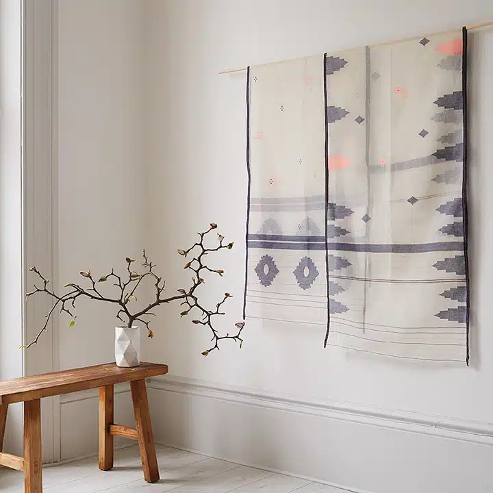 M.C: My experience of growing up in two places, Bangladesh and England, has been at the core of everything I make. There is a duality in my work, where things appear familiar to people yet retain a sense of otherness. For instance, my Jamdani pieces use classic Indian motifs but without the heavy patterning. The space between suggests a European aesthetic. Likewise, my Welsh blankets utilise traditional double cloth techniques but have pops of bright colour, inspired by the saris worn by my mother, grandmother and aunts. I grew up around vibrant colour in a culture where everyone instinctively knew what went with pink or green and unapologetically clashed colours. Yet, the Modernist movements in Europe and America, in particular, Bauhaus have always appealed. I think it’s the straight lines and geometry which strangely remind me of Islamic Art.