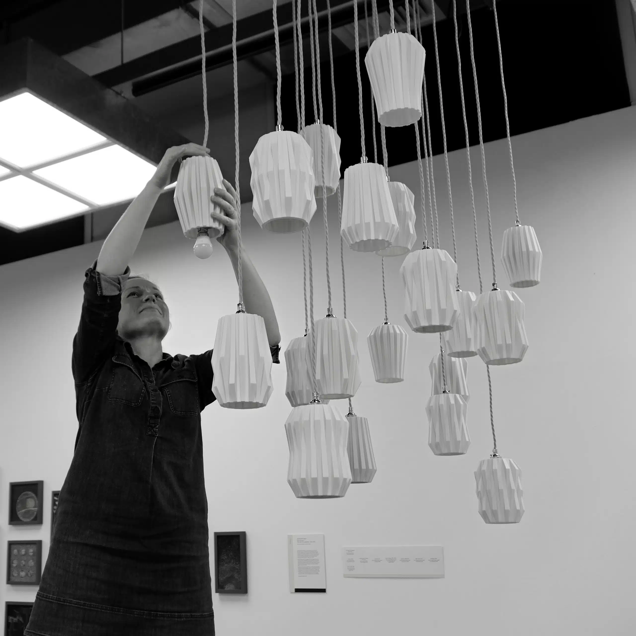 I thought I’d get myself up there for the evening opening, and make a bit of a day of it – and oh, it was so worthwhile. When I arrived at lunchtime, some artist-makers had already been, installed and gone, but others were still hard at work. There was Anna Thomson, perilously up a ladder, attending lovingly to her china pendants. Their immaculate geometry (achieved with some help from 3D printing) looked fine to us below, but Anna had perceived flaws – “and everything must be absolutely perfect – anyway what if someone buys one?” As well they might, as this clever lighting fits so well into a home. The design looks elegant on its own (suspended alongside a bed, for example) or dramatic in groups. Shades can fit an existing pendant, or hang from a smart braided flex with chrome fittings. Anna cleverly varies the clay bodies – for example vitrified porcelain gives a warm glow, whilst bone china is whiter and more translucent.
