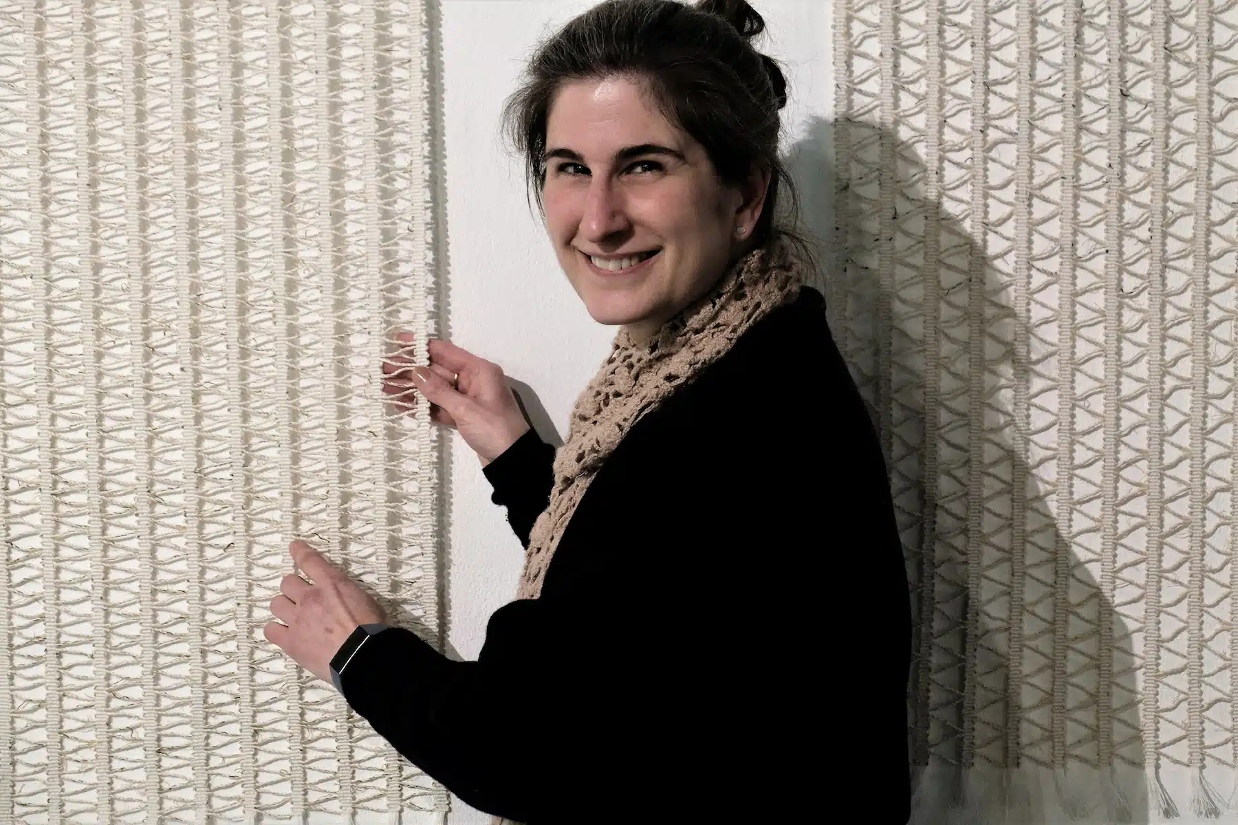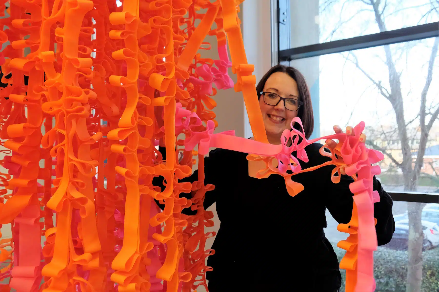 Across the way was Rachel Fitzpatrick, all the way from County Down, twisting, looping and tucking a giant cascade of hand-dyed pink Velcro strips, and making full use of the lofty ceiling. She and her art were just oozing with joy: “I’m so happy to be here!”