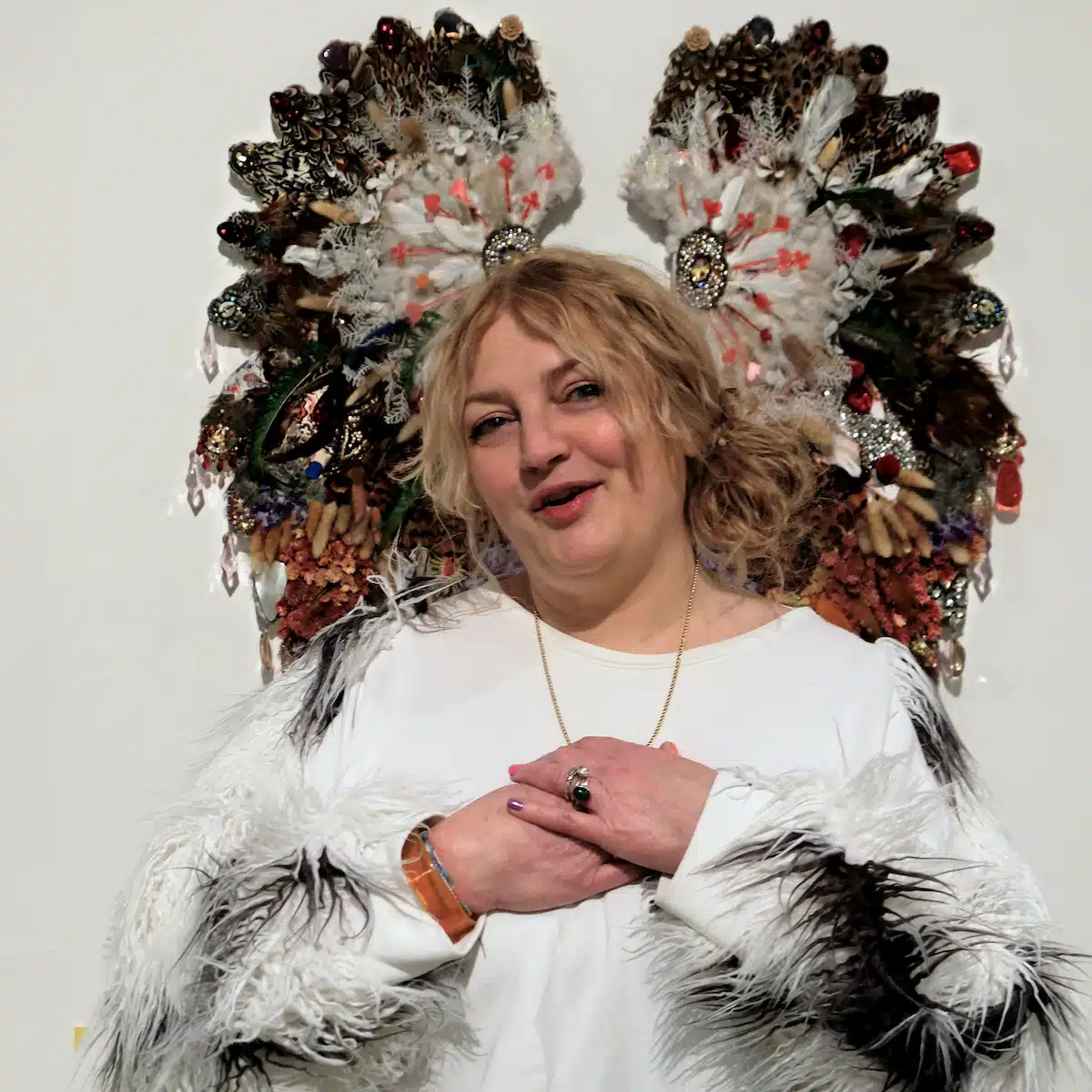 Michaela McMillan introduced her “angels,” each an intricate assemble of found objects, toys, models, discarded jewellery, feathers, stones and more, stitched and glued together, trapped beneath a glass dome. Fittingly, she posed for my photograph, framed by glittering wings she’d made for the wall. Michaela told me that this, her Chorus of Angels, was a response to the first year of the pandemic. For example, Angel Harmony shows Help and Friendship, and Angel Adorn Offers the Order of Strength. They are the largest pieces she’s ever made.