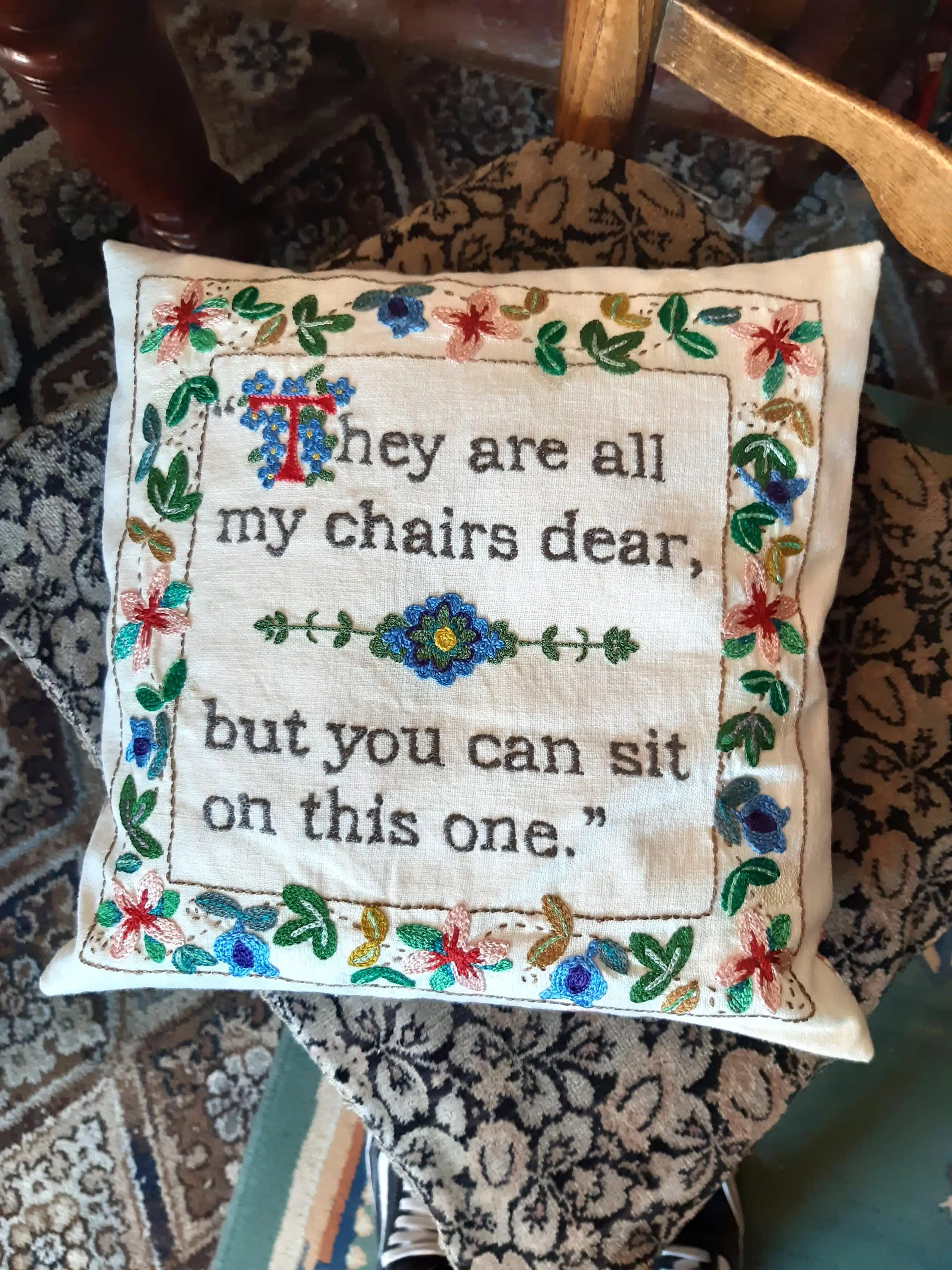 My upside was that I had work to do, creating pieces jointly planned with the interpretation team to add to the Cottage experience. At last I was able to settle down to embroidering text onto a pink cardigan (not a museum piece!) and creating a chair cushion stitched with Hilda Smith’s legendary response to a visitor: “They are all my chairs dear, but you can sit on this one,” with a border design developed from wallpaper fragments found in the Cottage.