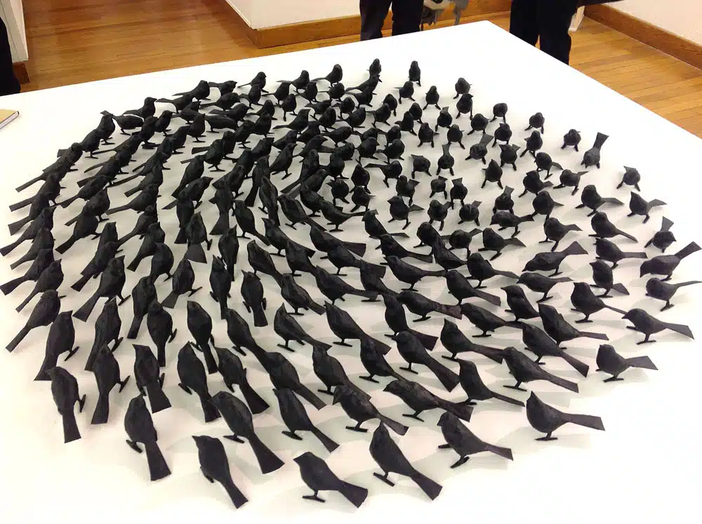 Repetition is a large part of my work. Whether it’s hundreds of folded paper birds, multiple stitched or cut lines or the repetitive actions made through stop motion animation, building up volume through repeated elements to create the whole.
