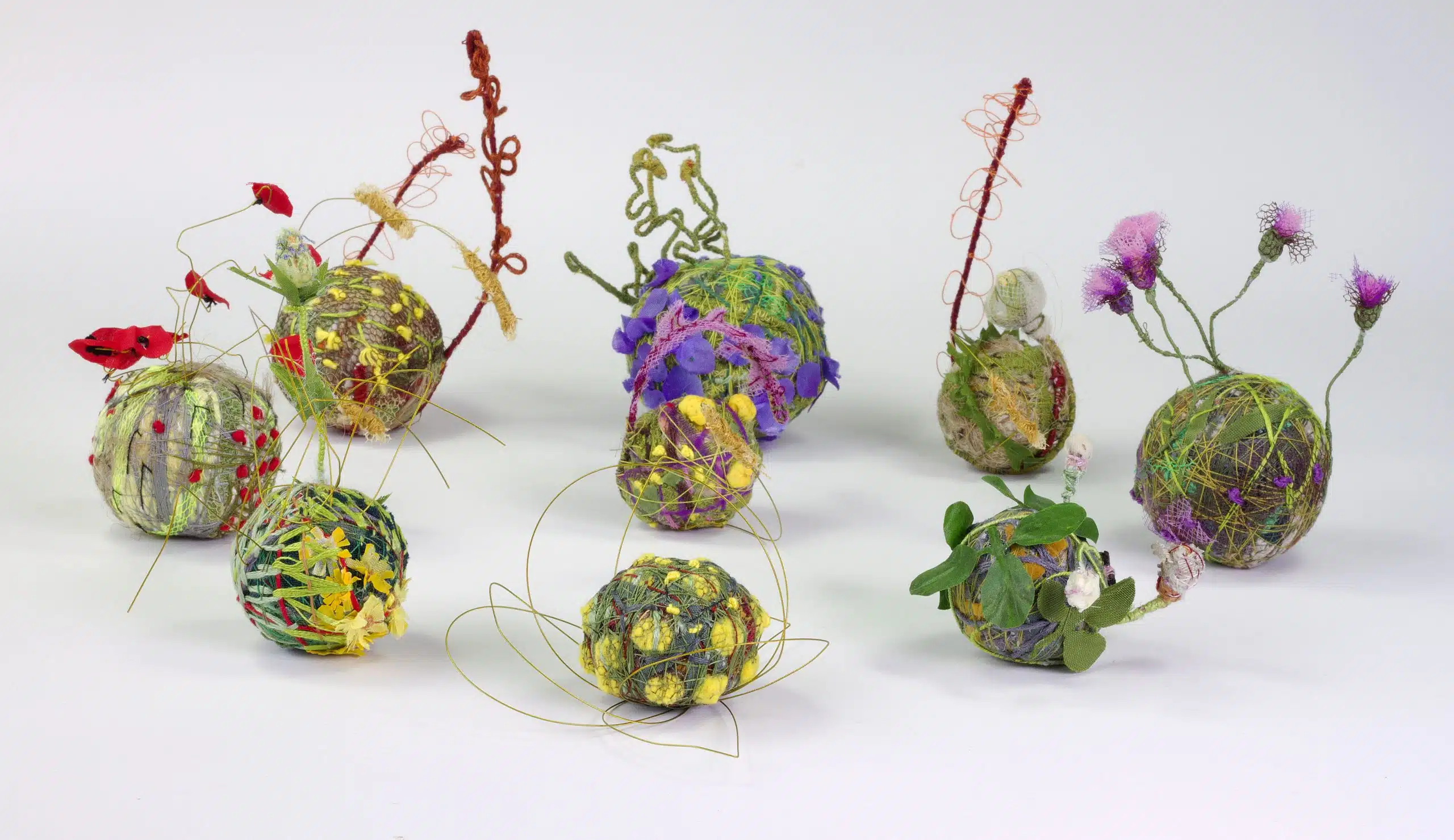 Mini-worlds came from my response to drawing in the landscape. The ball, created from scraps of fabric, is built up with layer upon layer of thread, these are then stitched into and a moment drawn in the landscape is encapsulated into 3D. Through this activity I discovered the Japanese embroidery technique of temari and refined my ball making; although the surface of the mini worlds remain more drawn rather than the geometric patterning found in temari. Each small sculpture focuses on the detail, its volume developed with a succession of stitched marks.