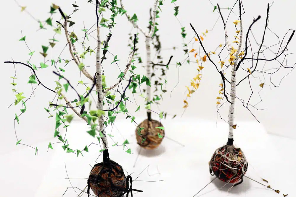 My mini-world sculptures speak about a fragile landscape, the changes in the seasons, the balance of nature. Installations of paper birds are of childhood memories and aim to communicate the child’s voice through the telling of stories.