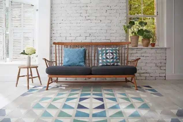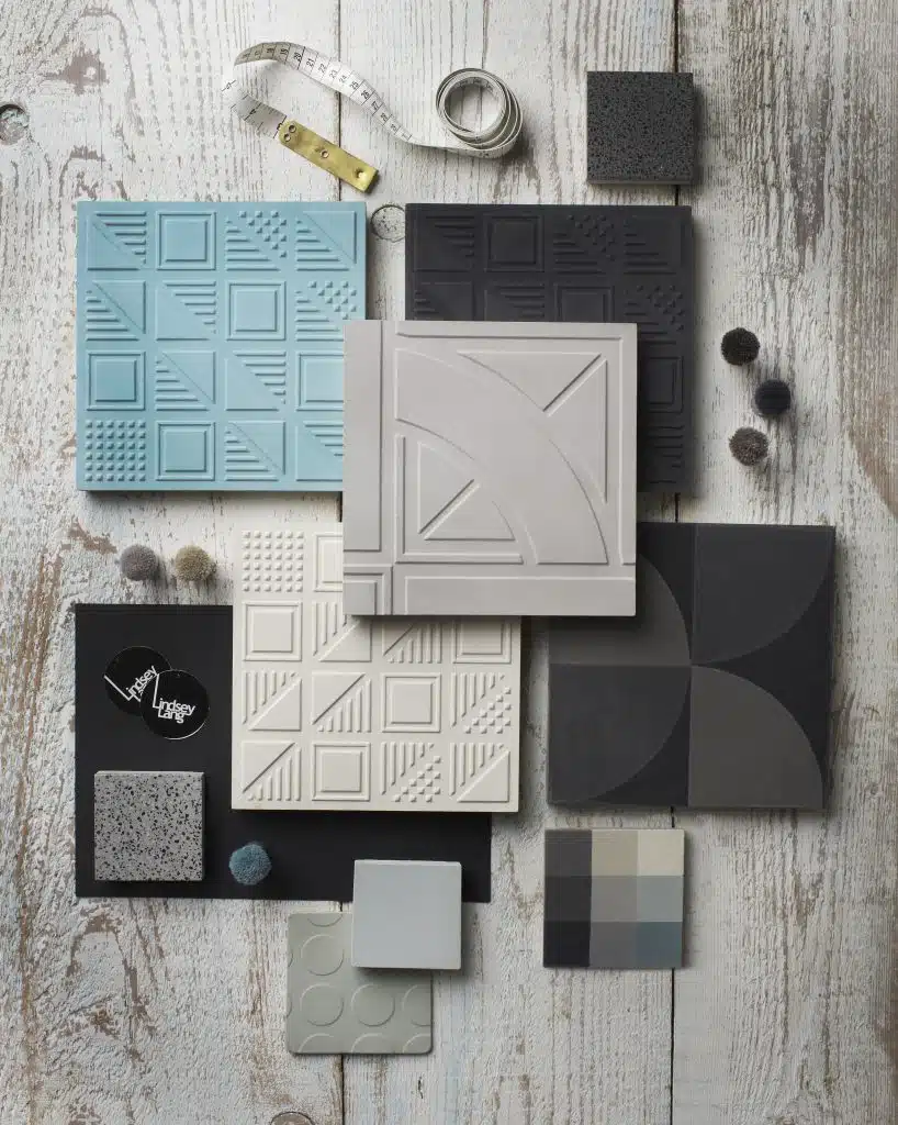 Photos: Lindsey in her studio; the new rug collection launched in December 2017; Lindsey’s mood board for her encaustic tile collection, lifestyle interior with Lindsey Lang tiles. All images courtesy Lindsey Lang.