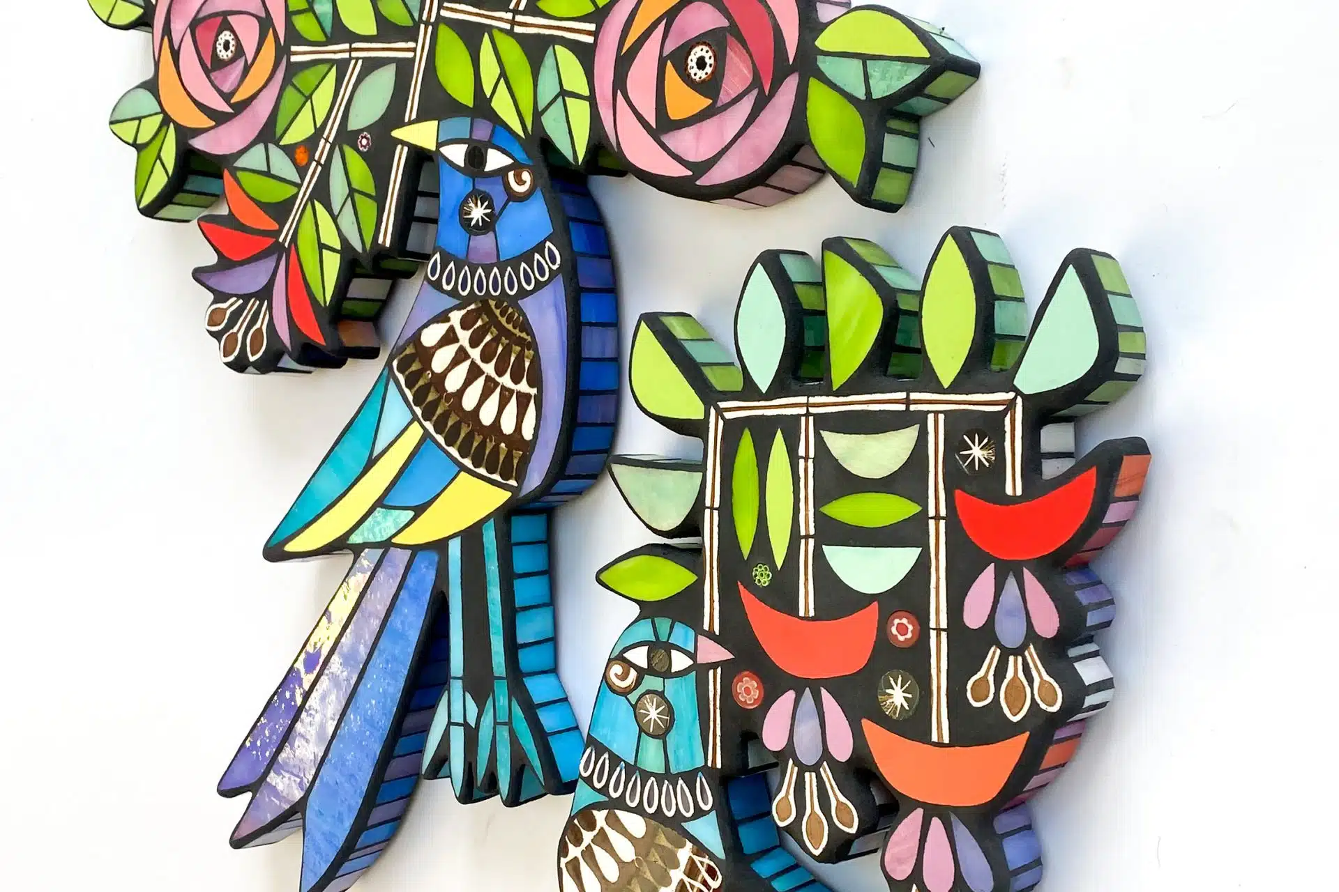 Meticulously crafted, Amanda’s work incorporates luminous stained glass cut into both large, gestural forms and small, uniform pieces; alongside ceramic tile and patterned pottery. A dark charcoal grout gives her mosaics a graphic clarity, creating bold silhouettes and intensifying the saturated hues that infuse her work with a vivid, joyful energy.