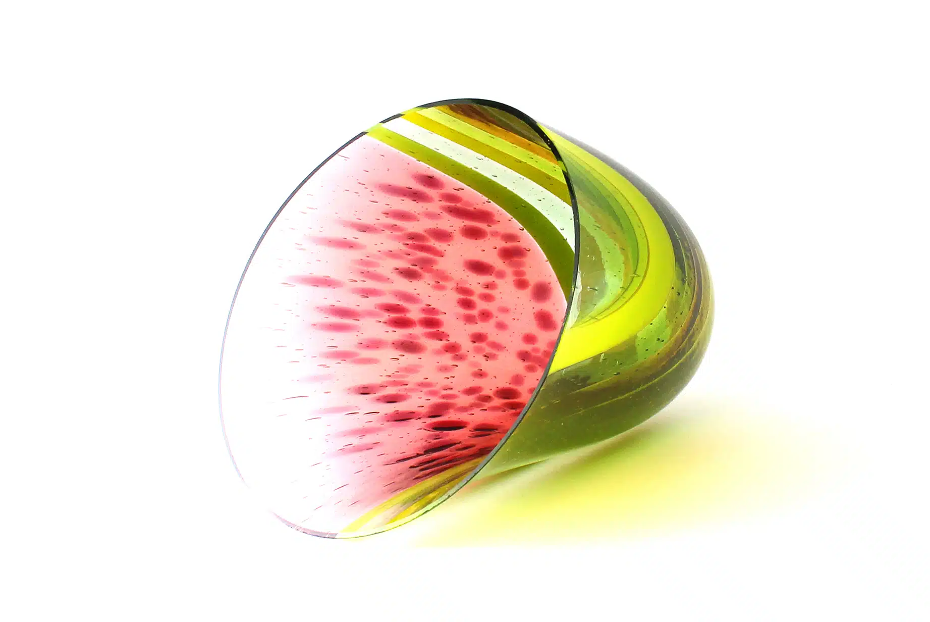 Light also played a key part in her pursuit of contrast: opaque and transparent glass are carefully juxtaposed, allowing for exciting light effects and depth throughout the objects Catherine creates. Some of her pieces were intended for use, whereas others such as her bevelled drop-out vessels, are finely crafted and decorative art objects. At the time of joining Design-Nation in 2020 Catherine was experimenting with movement and glass flow through sculptural slumping. This process enabled her to develop new wall art and sculptures, which encompassed colour, contrast, pattern, texture, light and movement: a feast for the senses.