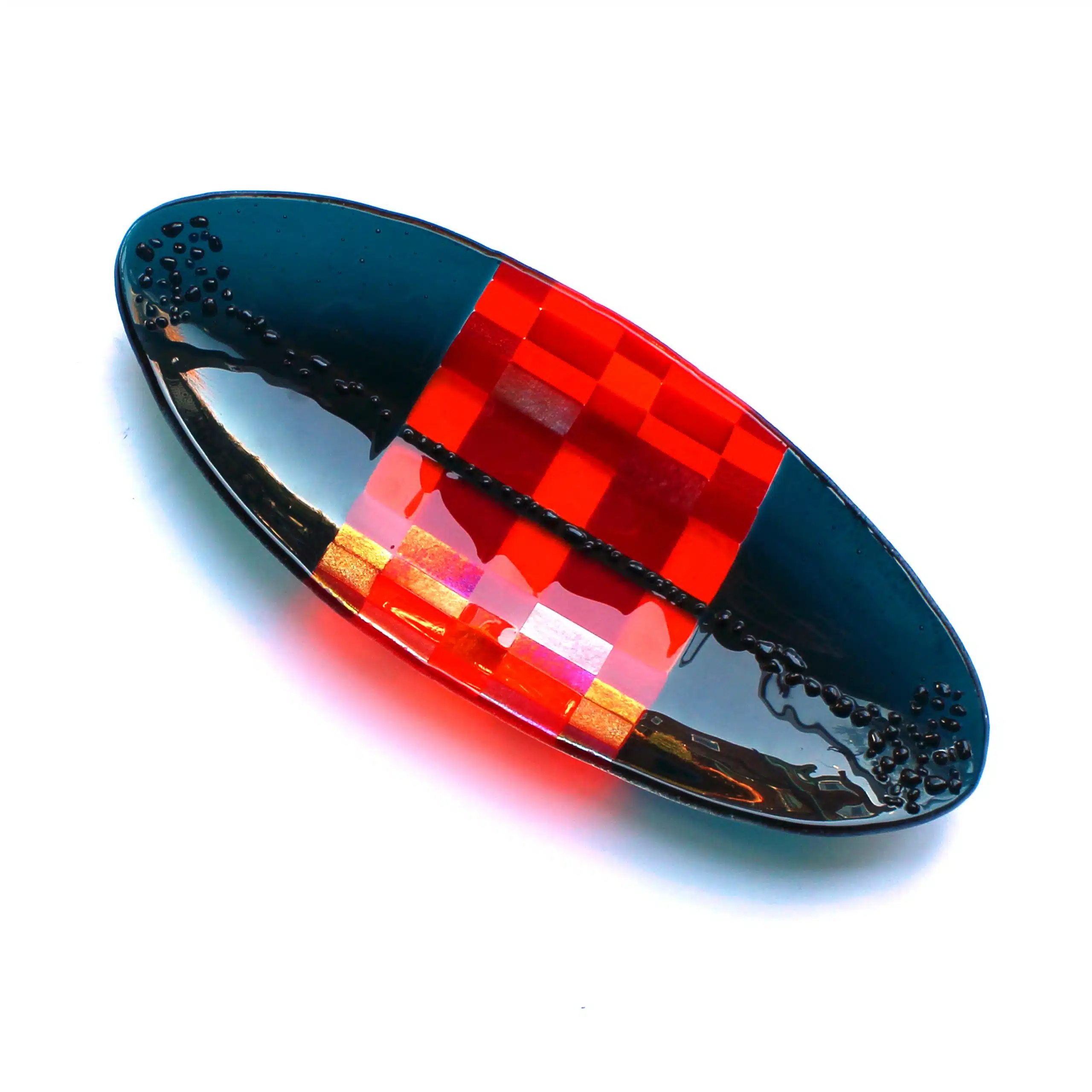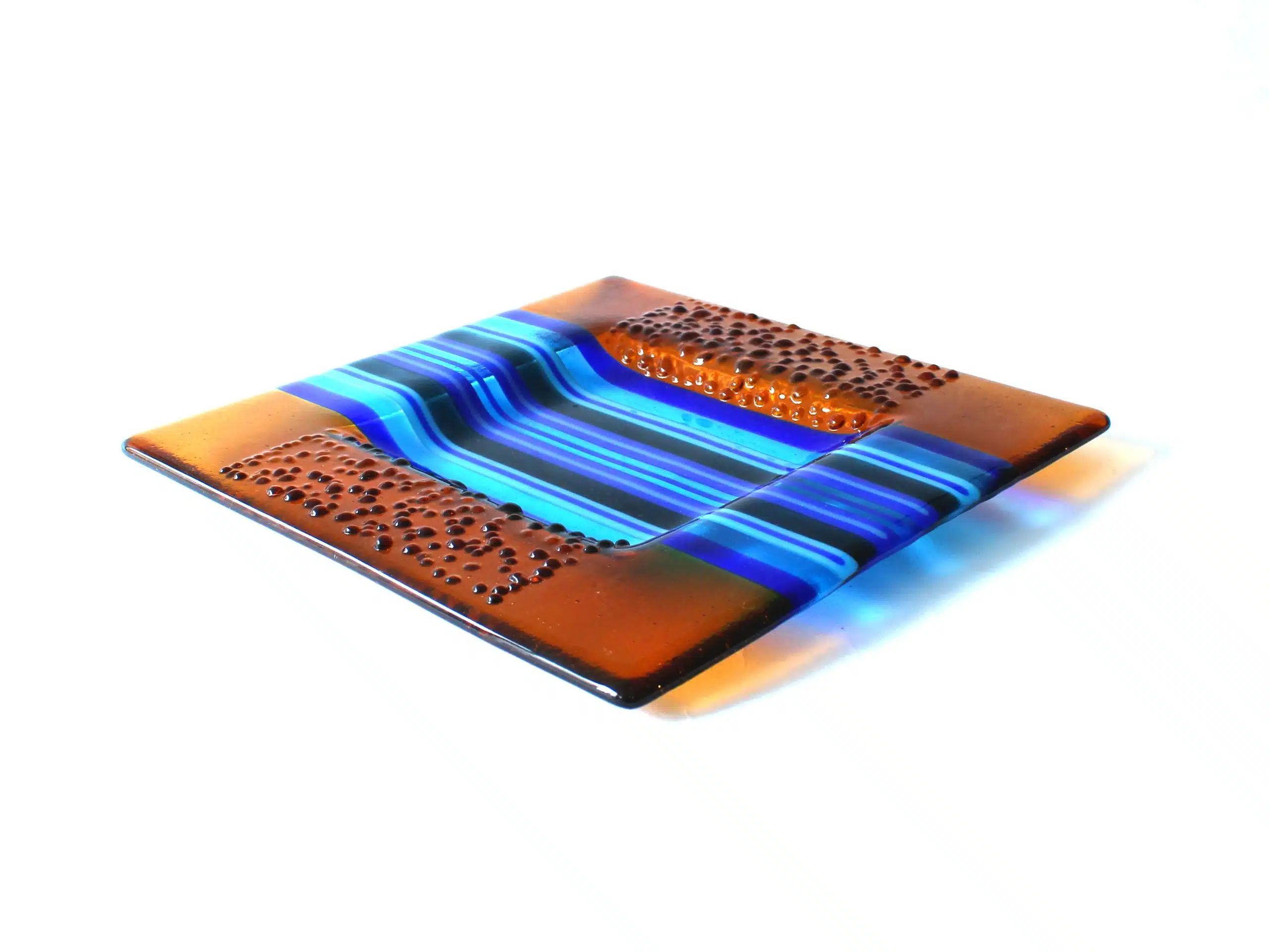 Catherine solely used Bullseye glass: this premier art glass is designed specifically for glass fusing and offers an exceptional range of colours and hues. She was attracted to contrast in many forms: through the constant development of bold and vibrant colour combinations, and the exploration of texture on a glossy and smooth glass surface.