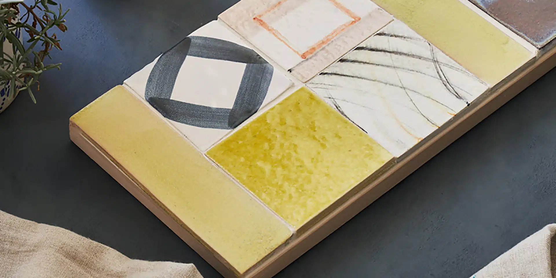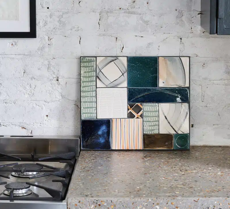 Caroline’s brushwork tiles are painterly and spontaneous; they reflect not only the influence of maiolica decoration from her training at Faenza in Italy but also her enjoyment of watercolour and delicate layering effects. Caroline explores textured repeat patterns to anchor the brushwork tiles and makes her glazes from natural oxides. These glazes bring surface interest and subtlety.
