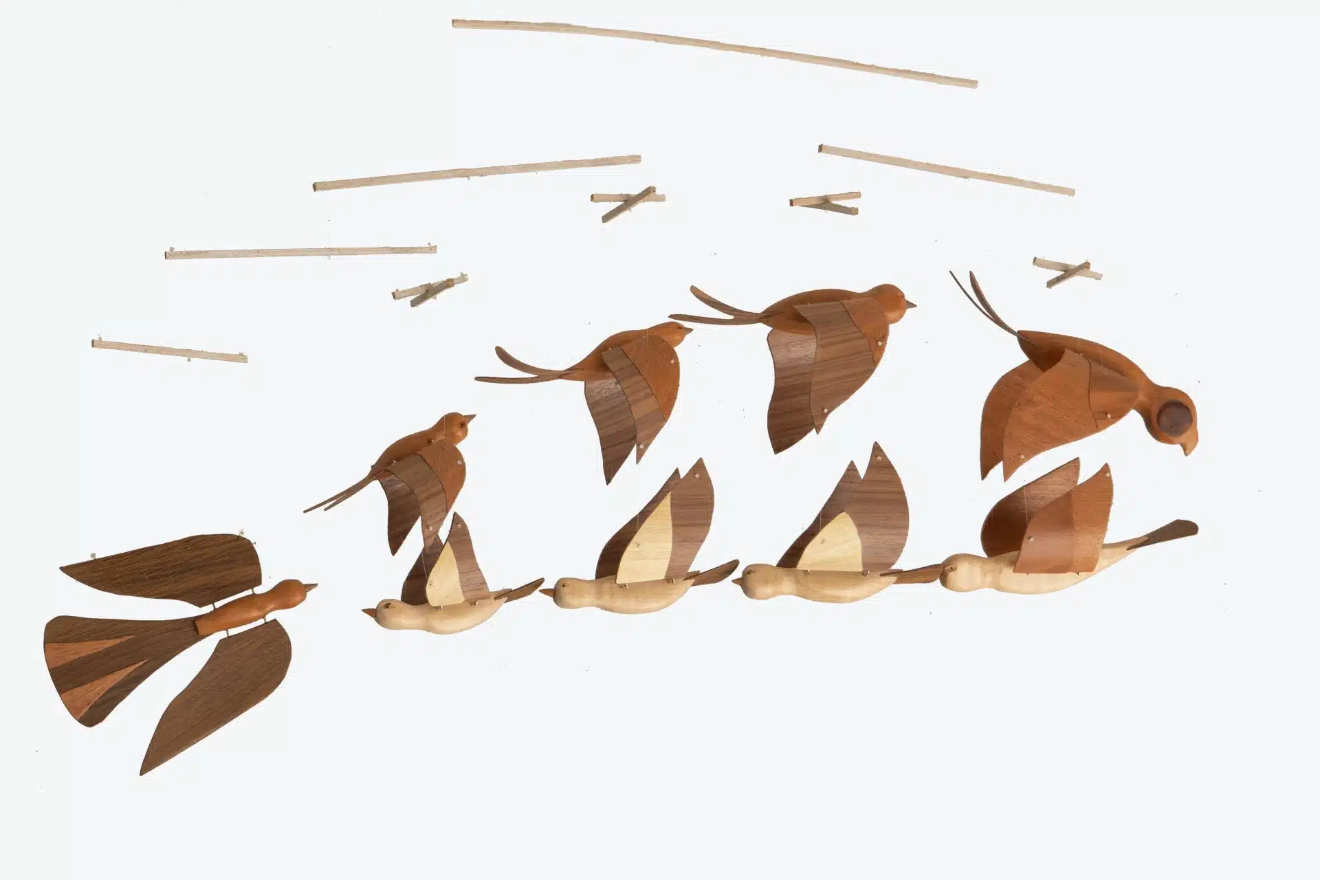 Jay Rubinstein makes wooden mobiles, often in response to poems or stories. His intention is to make objects that are beautiful but also carry meaning. He looks for ways in which mobiles will enable a single shape to represent different things depending on viewpoint or distance. Sometimes images appear and disappear as the air takes the piece, or the onlooker moves and changes perspective.