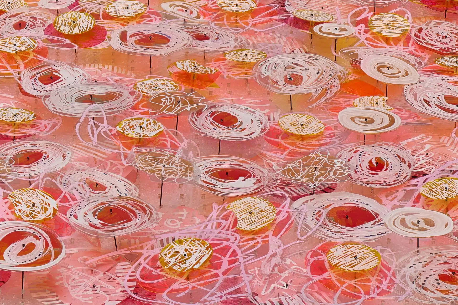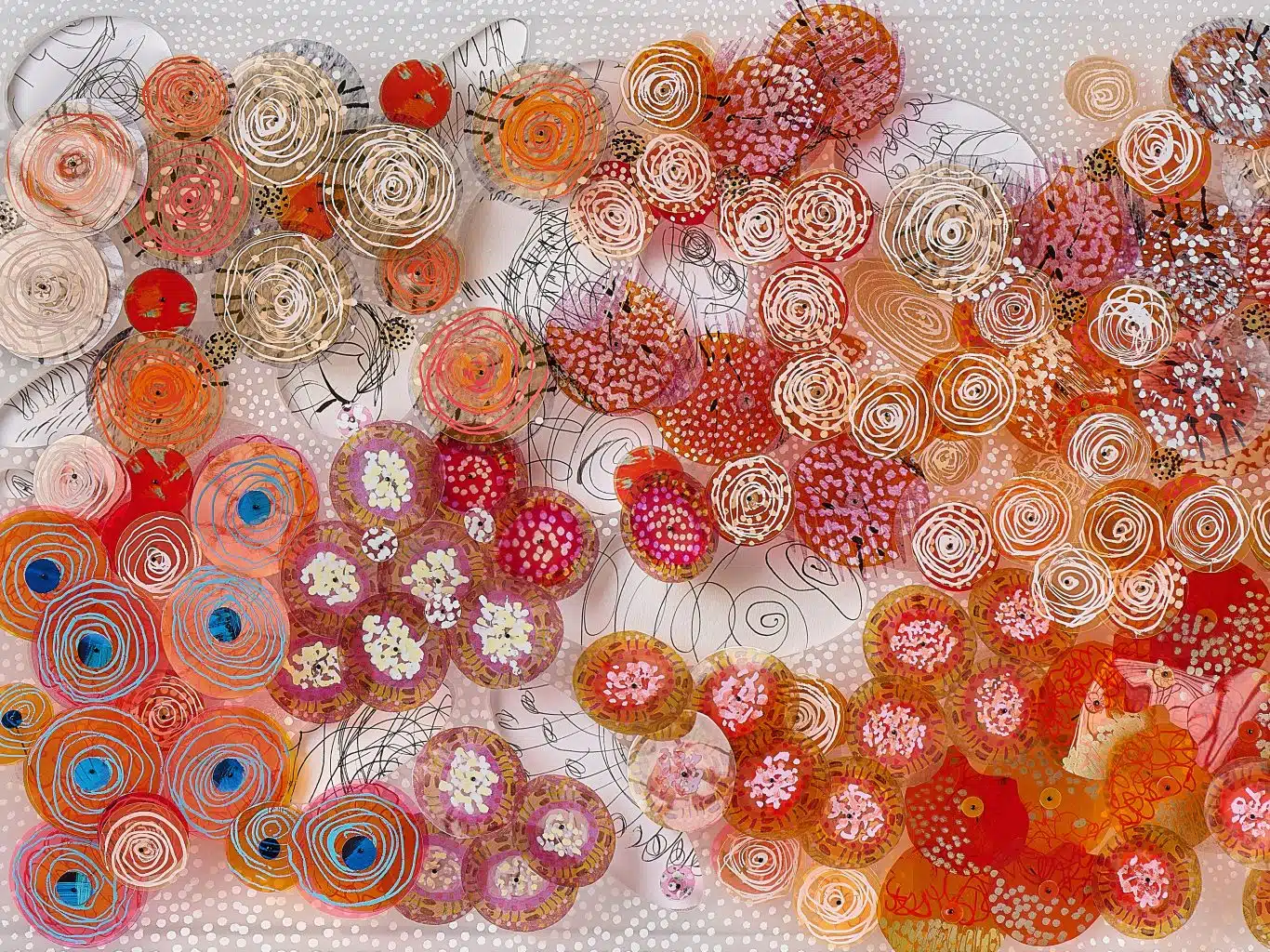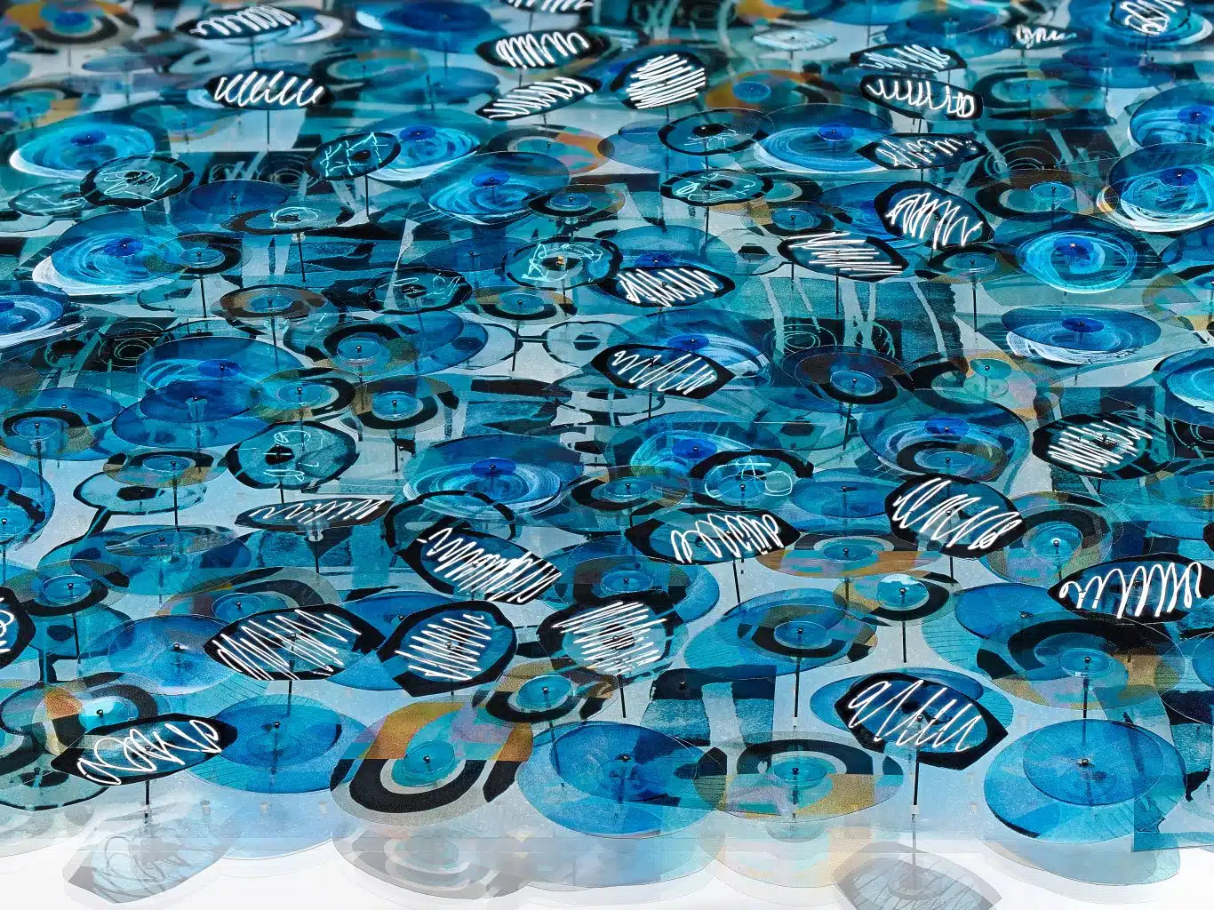 There is a lyrical energy and musicality about her work which is reflected in the use of colour, marks and gestures that come from a subconscious collection of observations and responses to the world around her. Colour is a key element combined with a fusion of different techniques to create floating fields of transparencies and reflections anchored with pins to a laser cut frame that lifts the work from the surface adding depth and texture to the finished piece. The result is a balance between complexity and elegance that is both tactile and visually engaging.