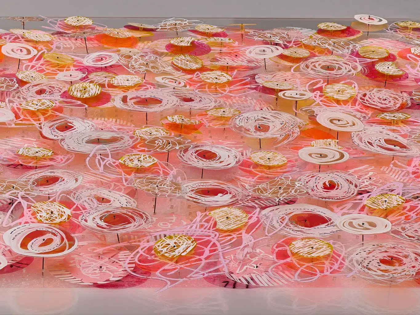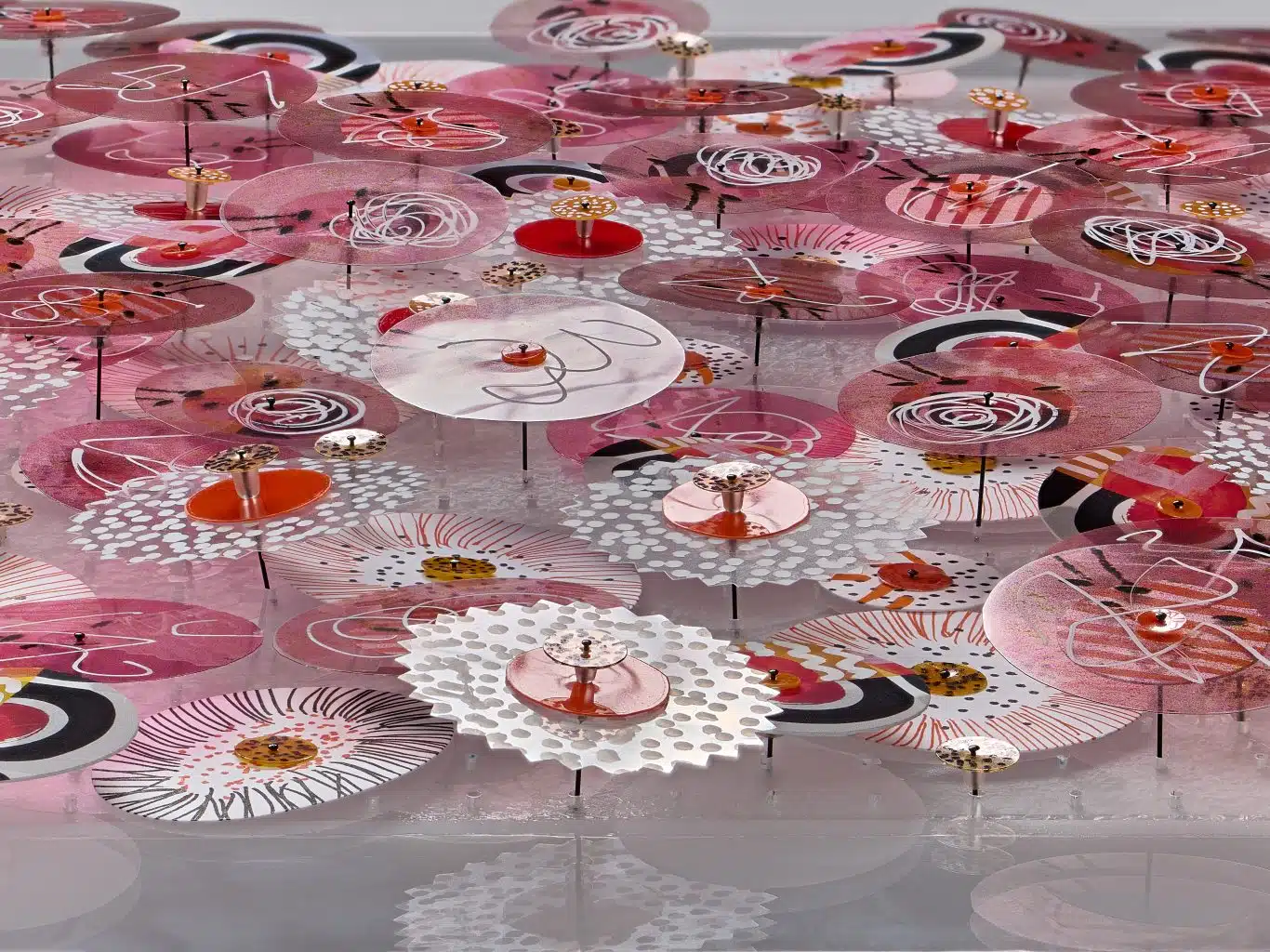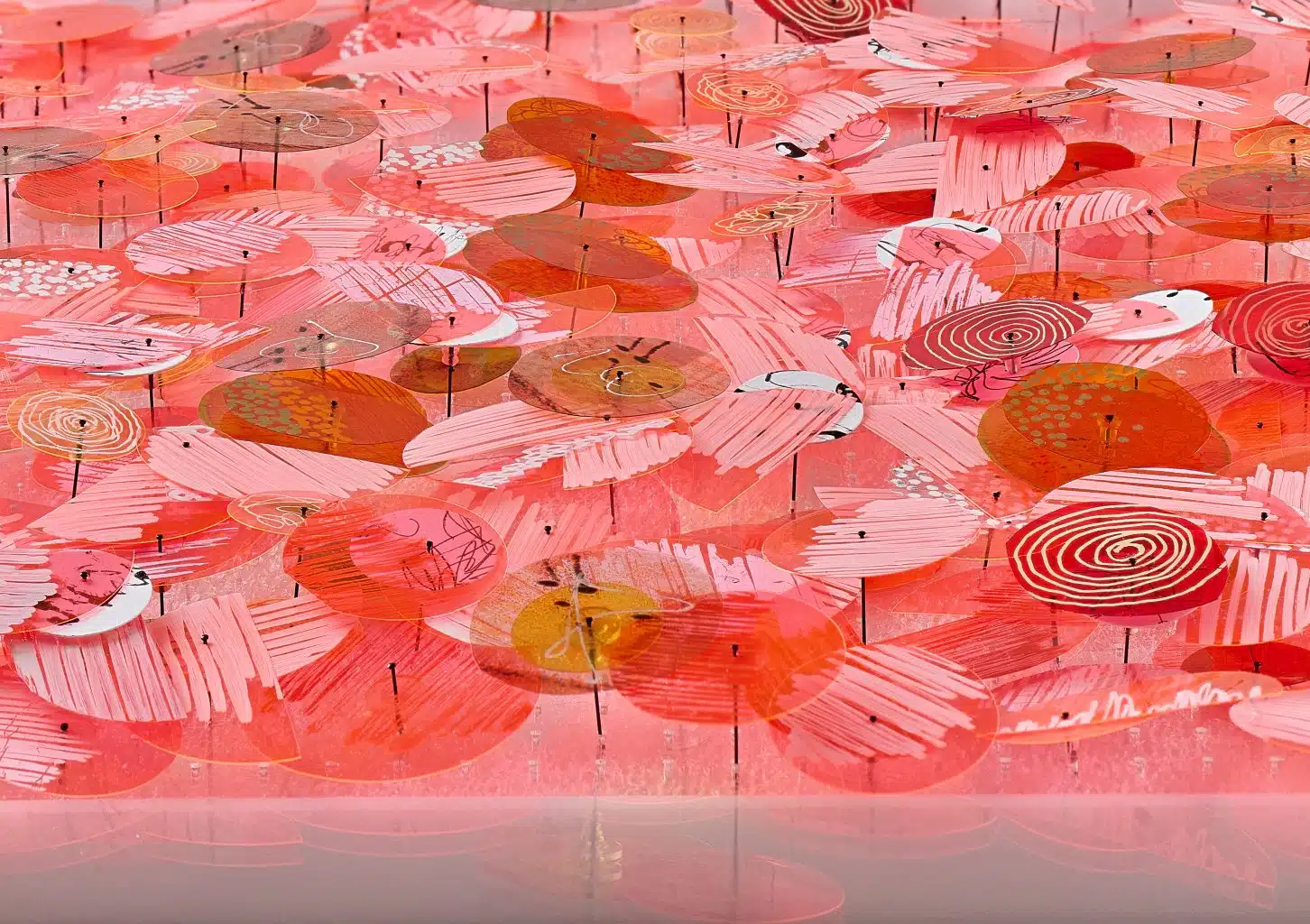 There is a lyrical energy and musicality about her work which is reflected in the use of colour, marks and gestures that come from a subconscious collection of observations and responses to the world around her. Colour is a key element combined with a fusion of different techniques to create floating fields of transparencies and reflections anchored with pins to a laser cut frame that lifts the work from the surface adding depth and texture to the finished piece. The result is a balance between complexity and elegance that is both tactile and visually engaging.
