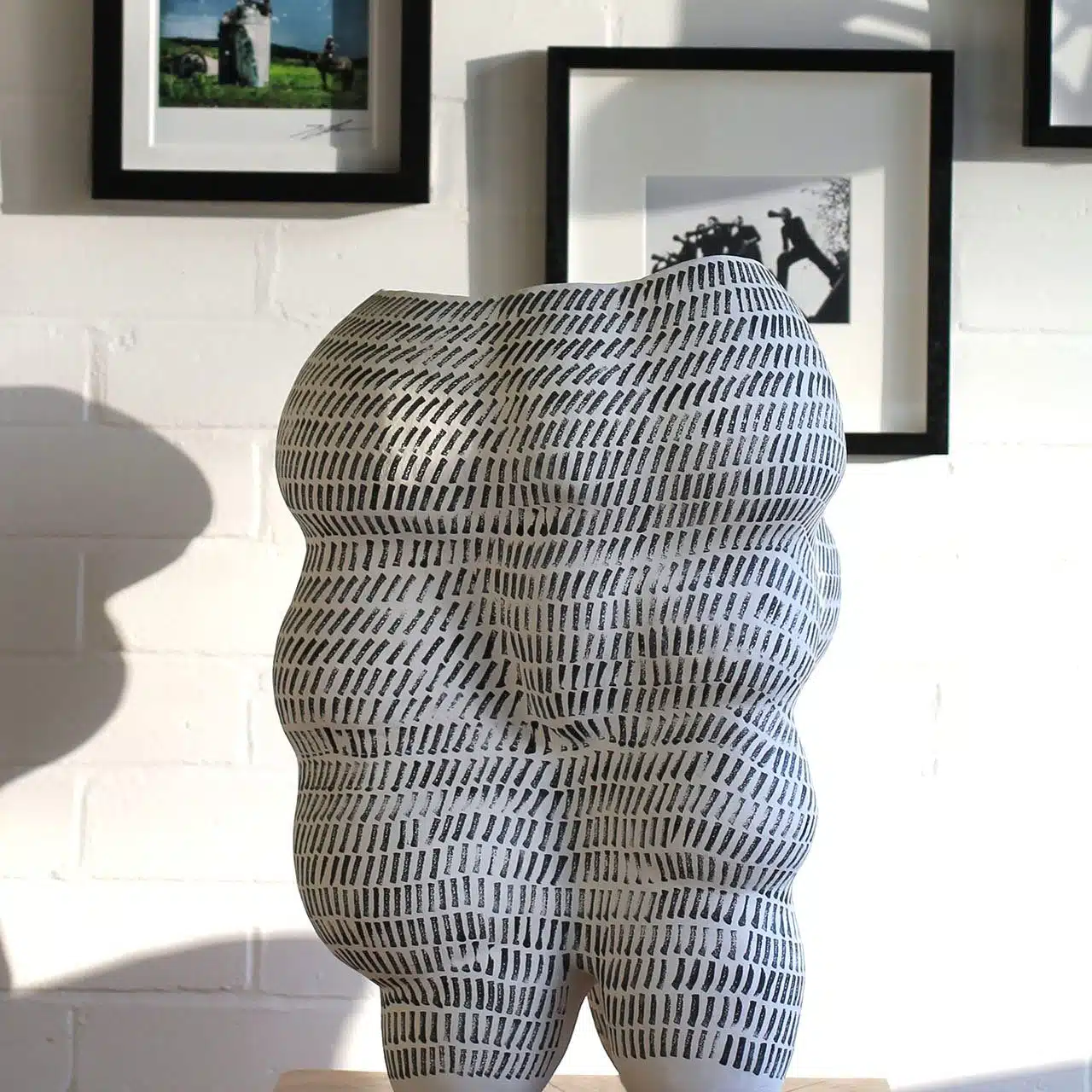 Working intuitively with her clay, Kerry uses pinch and coil techniques, stretching and pushing the clay out and guiding it in again, until the forms begin to develop their own dynamic and a certain trajectory is suggested. What starts out as something personal to Kerry inevitably becomes quite universal; she says, “It becomes just something very human”. The bulges and hollows of her forms develop a psychological and emotional resonance, an organic familiarity and sense of natural balance; artworks with a presence that one can relate to.