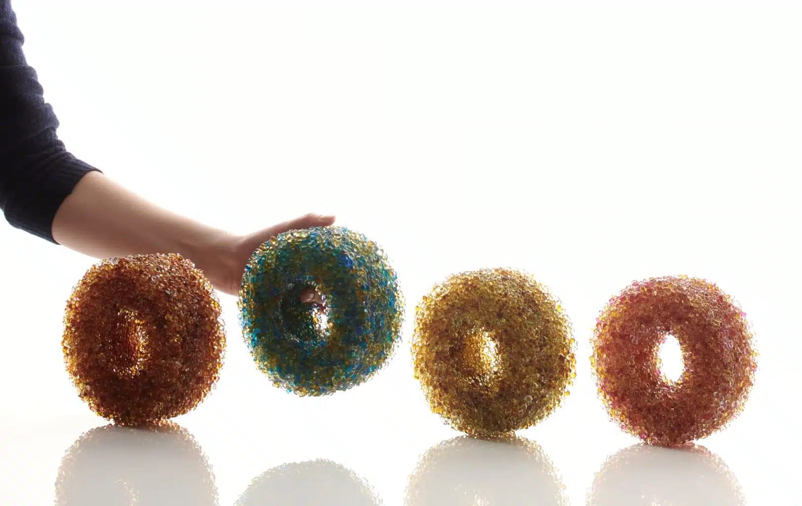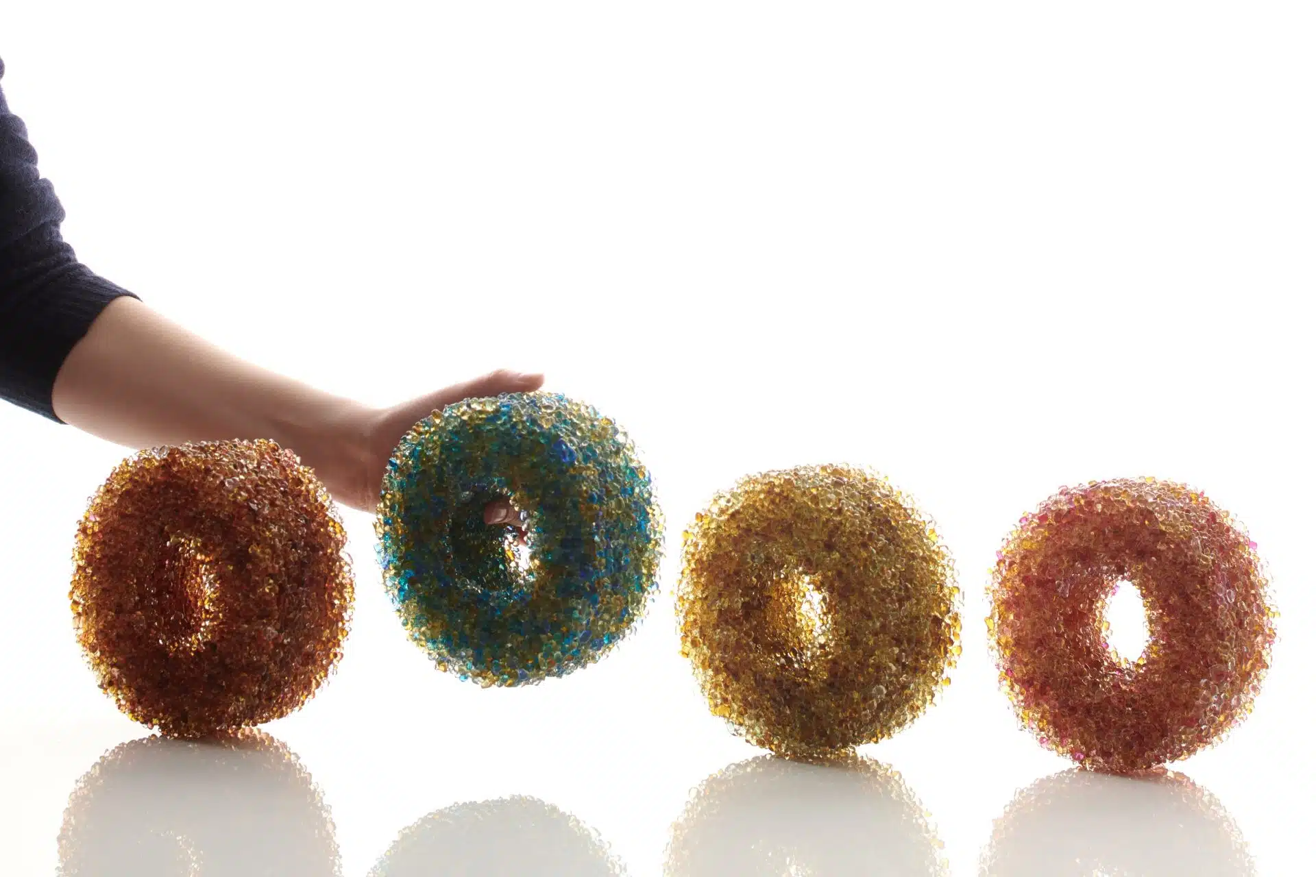 Since 2020 Kira has been delving into colour explorations and colour mixing through the Glass Ishihara series and the Superposition series. And she has continued to explore line work through the colourful layers of glass of the Constructure series and the delicate Palmately Netted Vein series.