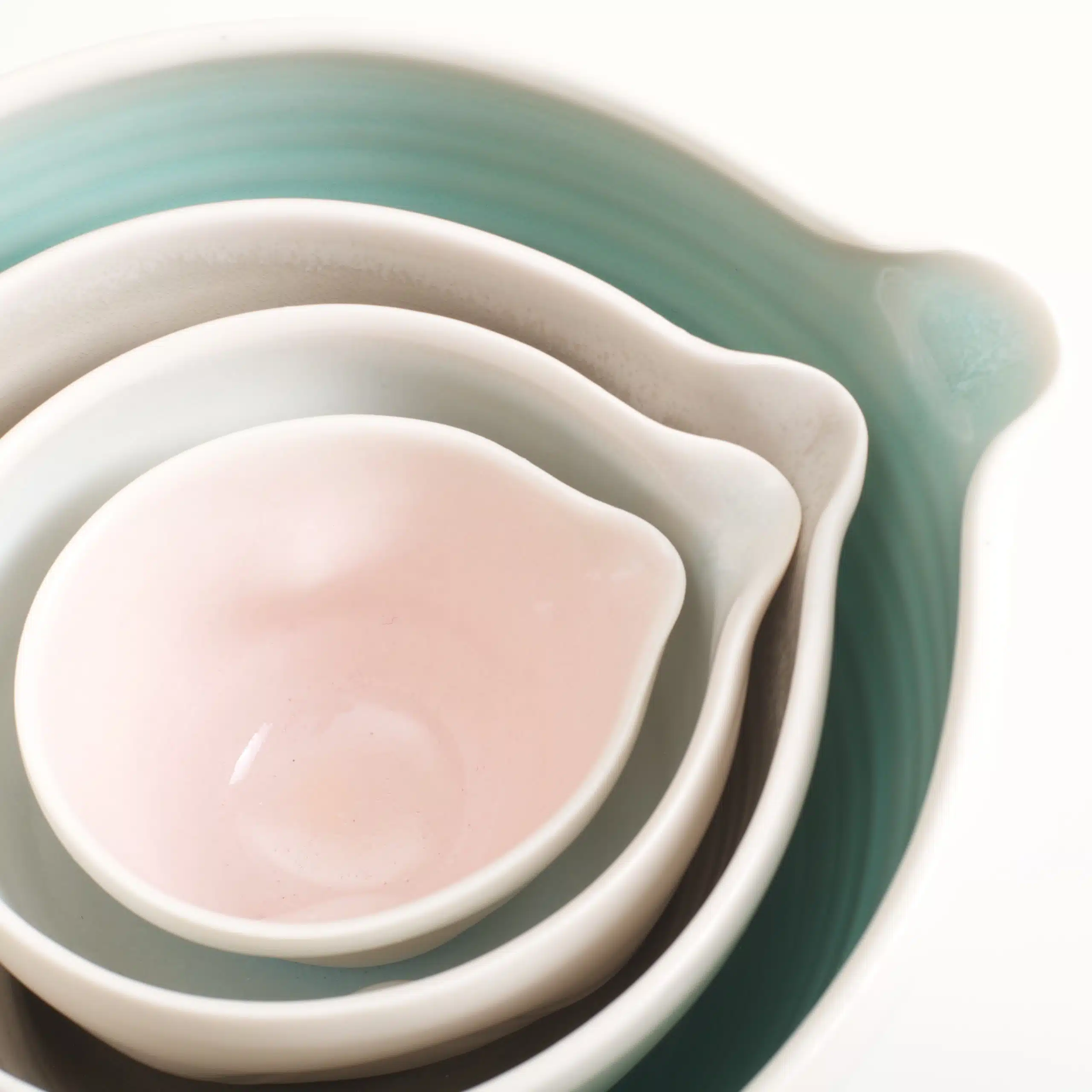 Linda Bloomfield designs and makes tableware based on her thrown porcelain, with dimples and visible throwing lines showing the hand of the maker. She uses a tactile satin matt glaze on the outside and colour on the inside. Linda makes her own range of glazes and is particularly interested in the translucent colours obtained using oxides rather than commercial stains. She has written several books on glazes and science for potters and teaches a course on colour in glazes.