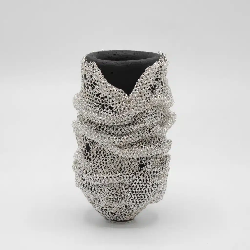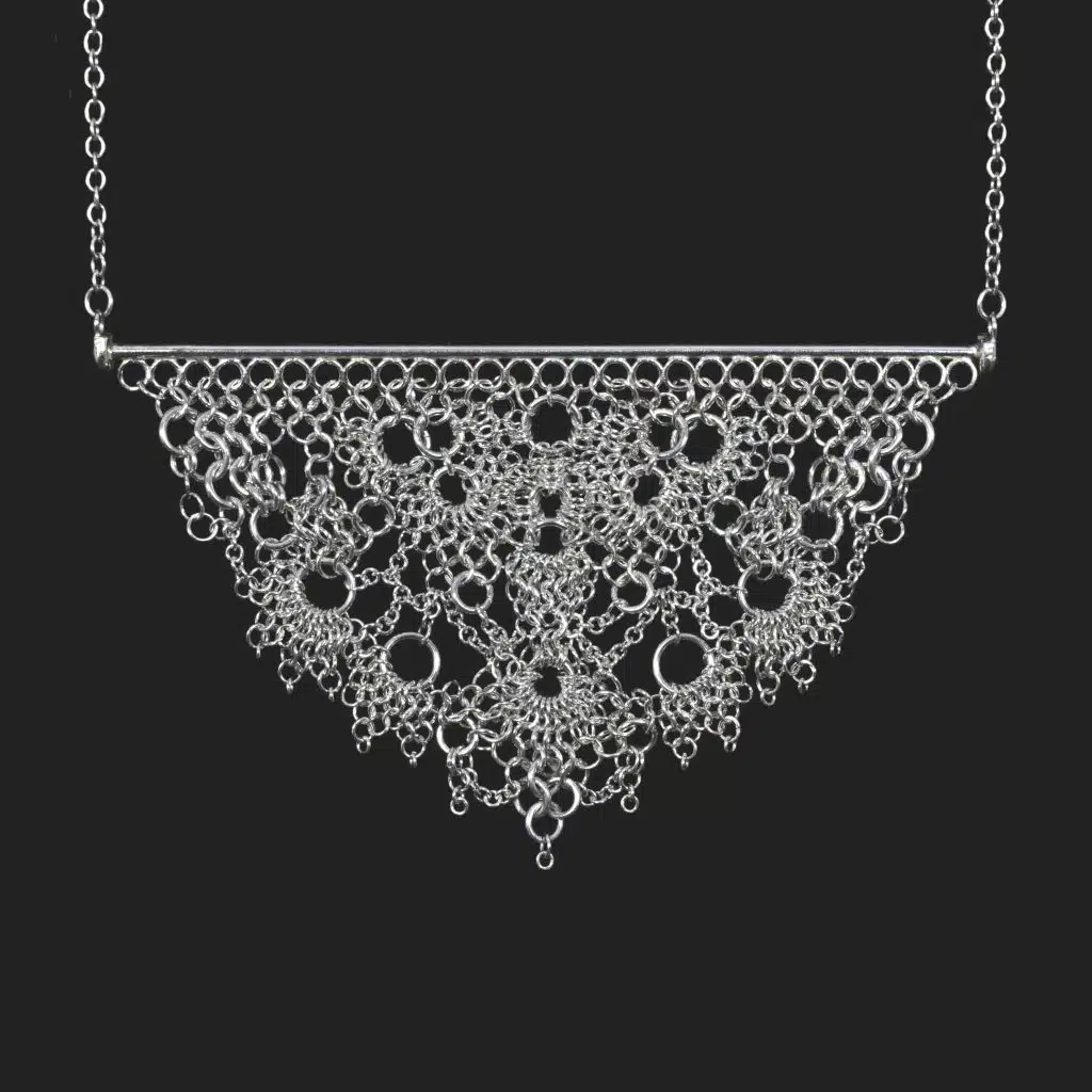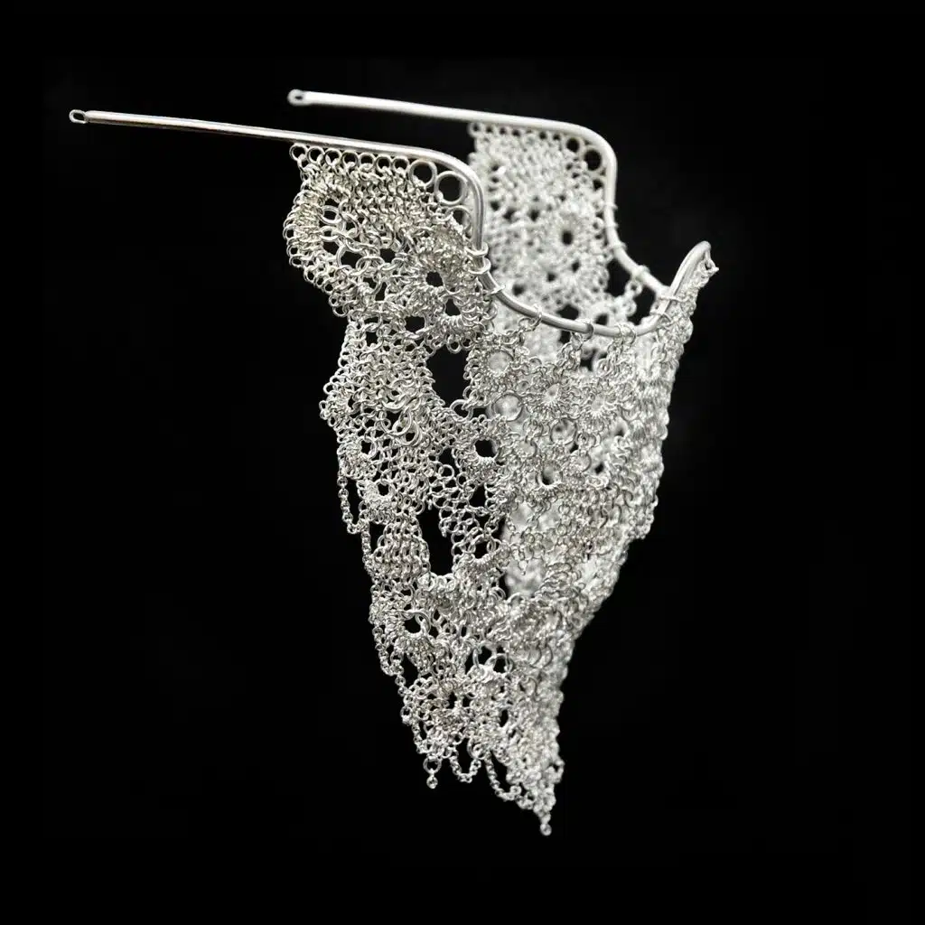 Katherine James is an artist and jewellery maker based in Leeds. She is best known for her unique re-imaginings of armour, made by crafting chainmail into many different forms and materials to alter its symbolic values. Her chainmail works have varied from lace patterns to semi-melted to chaotic disorder.