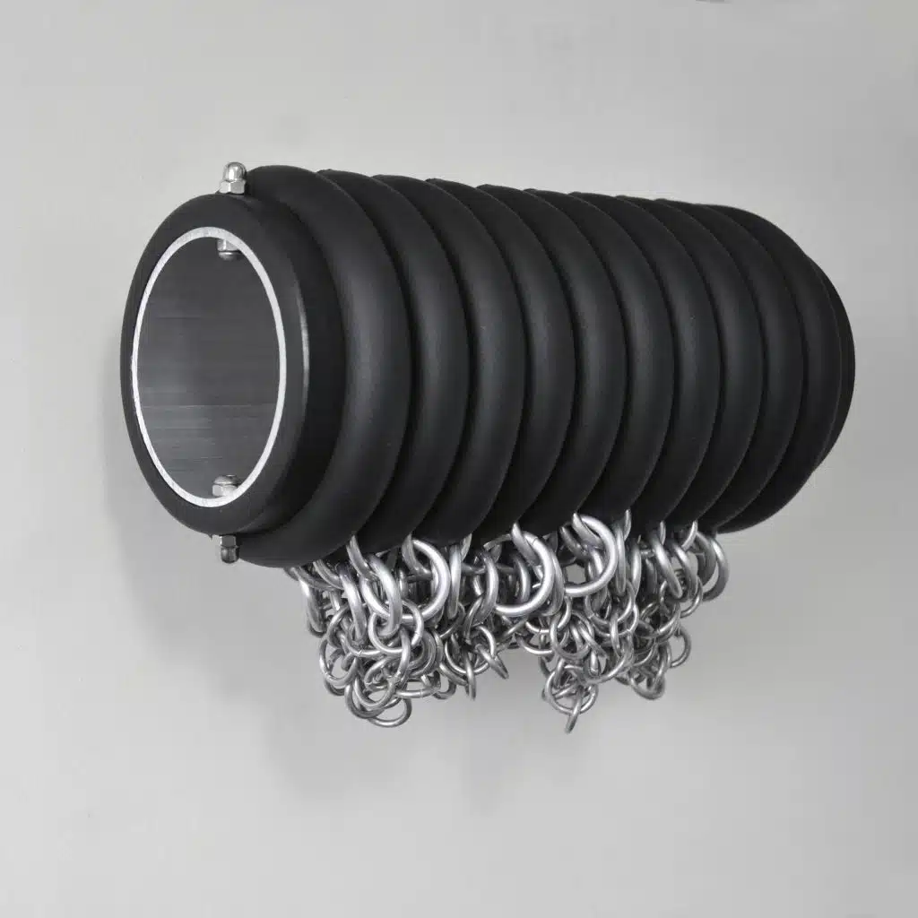Katherine’s practice is engaged with contemporary discourse including issues of gender and mental health. She challenges herself to push the boundaries of her craft, constructing ever more complex and intricate designs, and incorporating new materials. She finds the physical limitations of her process, applying the rules of her craft sparsely to seek what qualifies as chainmail, exploring the hierarchies between art and craft and symmetry and illegible pattern. Her pieces are often highly time-consuming to create and can take weeks and in some cases months to complete. Her expression is not bound by scale and can take the form of body adornments and large-scale sculpture.