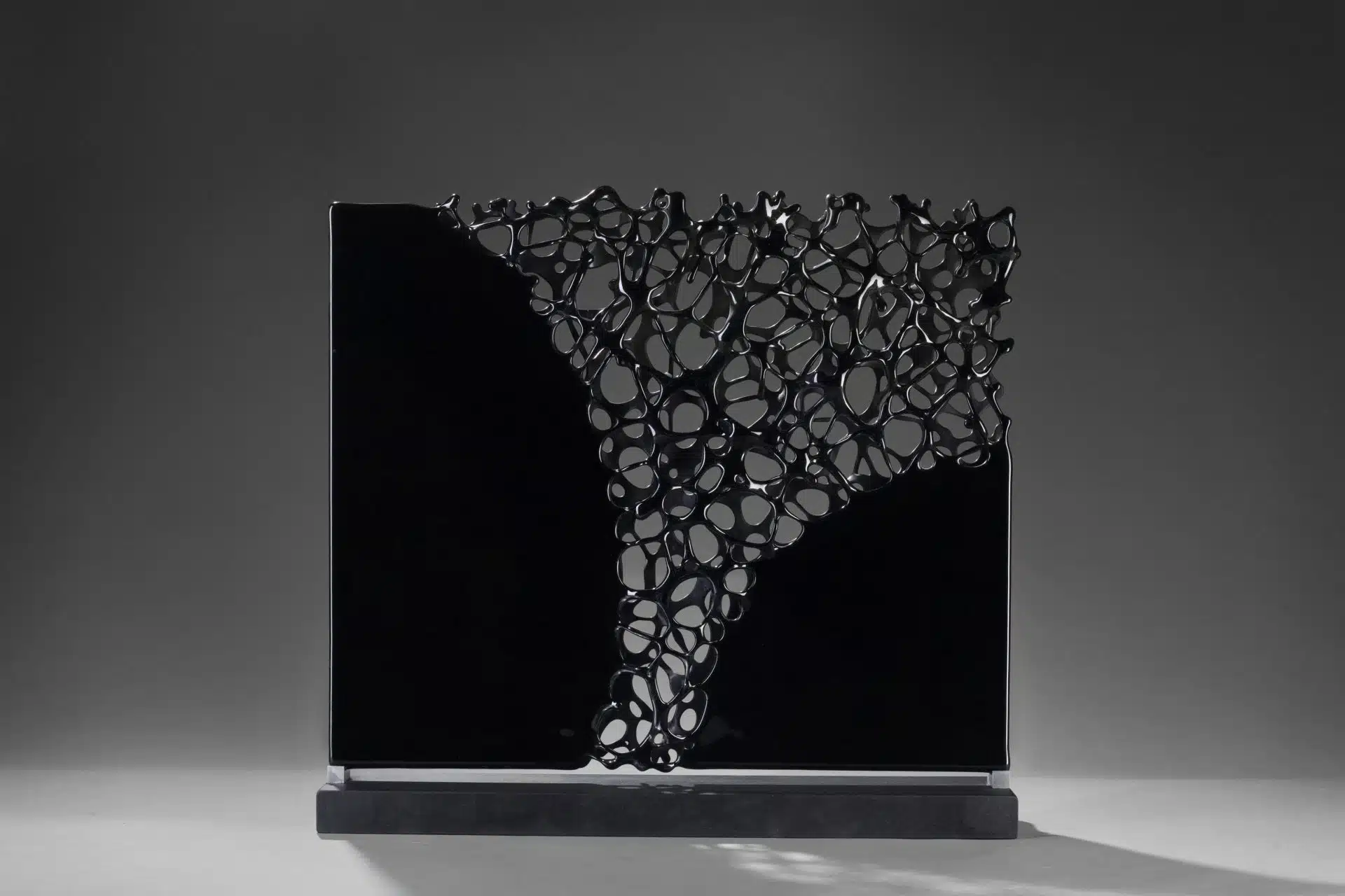 Rejecting the qualities typically associated with glass – transparency, vibrancy and shine – Tracy gravitates toward a restrained monochrome palette and opaque glass. Using the heat of the kiln, she manipulates and distorts the glass, exploiting the tension that exists between the planned and the unexpected, whilst pushing the material’s physical limits to reveal delicate structures shaped by both intention and chance. She sees her work as perfectly imperfect – edges crumble while pitting, cracks and holes emerge.